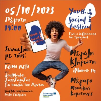 *H Περιφέρεια Ανατολικής Μακεδονίας και Θράκης σας προσκαλεί στο Φεστιβάλ Νέων (Youth Festival) που θα διεξαχθεί στον προαύλιο χώρο του Μεγάρου Μουσικής Κομοτηνής την Πέμπτη 5 Οκτωβρίου στις 19:00 το οποίο θα περιλαμβάνει: