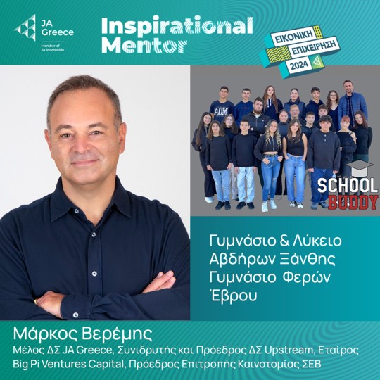 Ο Μάρκος Βερέμης, Μέλος ΔΣ JA Greece, Συνιδρυτής και Πρόεδρος ΔΣ Upstream, Εταίρος Big PiVentures Capital, Πρόεδρος Επιτροπής Καινοτομίας ΣΕΒ, είναι Inspirational Mentor 2024 στην «Εικονική Επιχείρηση» που δημιουργείται και διαγωνίζεται κατά την τρέχουσα σχολική χρονιά στο Γυμνάσιο και Λύκειο Αβδήρων Ξάνθης & Γυμνάσιο Φερών Έβρου.