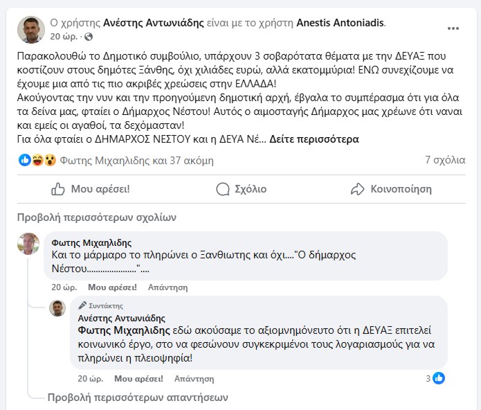 «ΑΝΕΣΤΗΣ ΑΝΤΩΝΙΑΔΗΣ. Παρακολουθώ το Δημοτικό συμβούλιο, υπάρχουν 3 σοβαρότατα θέματα με την ΔΕΥΑΞ που κοστίζουν στους δημότες Ξάνθης, όχι χιλιάδες ευρώ, αλλά εκατομμύρια! ΕΝΩ συνεχίζουμε να έχουμε μια από τις πιο ακριβές χρεώσεις στην ΕΛΛΑΔΑ!