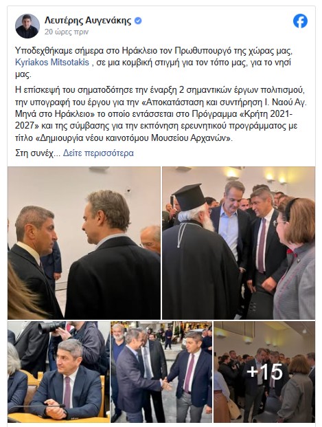 «Υποδεχθήκαμε σήμερα στο Ηράκλειο τον πρωθυπουργό της χώρας μας, Kyriakos Mitsotakis, σε μια κομβική στιγμή για τον τόπο μας, για το νησί μας. Η επίσκεψή του σηματοδότησε την έναρξη δύο σημαντικών έργων πολιτισμού: την υπογραφή του έργου για την “Αποκατάσταση και συντήρηση Ι. Ναού Αγ. Μηνά στο Ηράκλειο”, το οποίο εντάσσεται στο Πρόγραμμα “Κρήτη 2021-2027” και της σύμβασης για την εκπόνηση ερευνητικού προγράμματος με τίτλο “Δημιουργία νέου καινοτόμου Μουσείου Αρχανών”.
