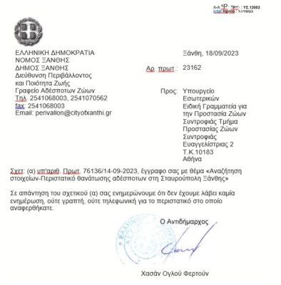 Σχετ: (α) υπ’αριθ. Πρωτ. 76136/14-09-2023, έγγραφο σας με θέμα «Αναζήτηση στοιχείων-Περιστατικό θανάτωσης αδέσποτων στη Σταυρούπολη Ξάνθης»