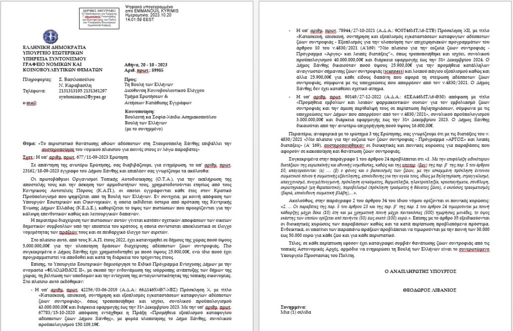 Και ιδού και η απάντηση ντοκουμέντο του Αναπληρωτή Υπουργού Εσωτερικών Θόδωρου Λιβάνιου στην ΕΛΛΗΝΙΚΗ ΛΥΣΗ για τα ΚΟΝΔΥΛΙΑ που πήρε ο Δήμος Ξάνθης για τα αδέσποτα.
