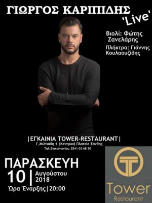 Την Παρασκευη 10 Αυγούστου θα γίνουν τα επίσημα εγκαίνια του Tower restaurant στην κεντρική πλατεία της Ξάνθης, κάτω απο το ρολόγι. Στην εκδήλωση θα υπάρχει και ζωντανή μουσική με τον Γιώργο Καρυπίδη και την ορχήστρα του.
