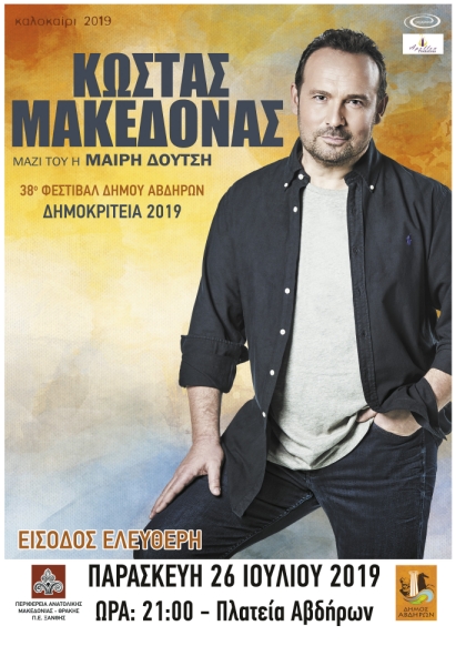 Με τη συναυλία του Κώστα Μακεδόνα στις 26 Ιουλίου στην πλατεία των Αβδήρων κορυφώνονται τα φετινά Δημοκρίτεια 2019 του Δήμου Αβδήρων.