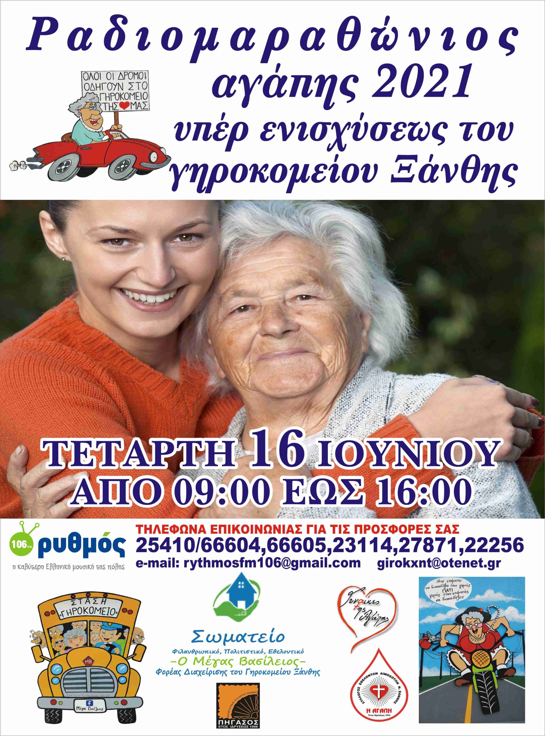 Το Γηροκομείο Ξάνθης -Ίδρυμα «O ΜΕΓΑΣ ΒΑΣΙΛΕΙΟΣ» στο πλαίσιο της συνεχιζόμενης προσπάθειάς του για την ευαισθητοποίηση των πολιτών σε κοινωνικά θέματα, διοργανώνει για ΔΕΚΑΤΗ συνεχή χρονιά τον Ραδιομαραθώνιο Αγάπης και προσφοράς για την ενίσχυση του Γηροκομείου, την Τετάρτη 16 Ιουνίου 2021 από 9:00 έως 16:00, ώστε η παλιότερη μονάδα φροντίδας ηλικιωμένων του Νομού μας να συνεχίσει να λειτουργεί, να επεκτείνεται και να αντιμετωπίζει με σθένος όλα τα προβλήματα που ανακύπτουν. Η ημέρα του Ραδιομαραθωνίου είναι καθαρά συμβολική. Απλώς εκείνη την ημέρα συνήθως ανακοινώνονται μέσω της κοινής ραδιοζεύξης οι κάθε είδους προσφορές από ιδιώτες, εταιρίες και φορείς, επώνυμα ή ανώνυμα, που ήδη ξεκινούν λίγες μέρες νωρίτερα, από την Δευτέρα 7 Ιουνίου και τελειώνουν την Τετάρτη 30 Ιουνίου. Οι δε κουμπαράδες που για τον ίδιο σκοπό υπάρχουν σε διάφορα σημεία της πόλης συνεχίζουν να λειτουργούν και να φιλοξενούνται έως την Κυριακή στις 27 Ιουνίου. Έτσι δίνεται η ευκαιρία και ο χρόνος για τον καθένα που θέλει να προσφέρει, να εκδηλώσει με όποιον τρόπο θέλει και επιθυμεί τη συμπαράστασή ανθρωπιάς και κοινωνικής αλληλεγγύης του στο παλαιότερο Ίδρυμα της περιοχής μας με τα 57 έτη ιστορίας και κοινωνικής προσφοράς (έτος ίδρυσης το 1964).