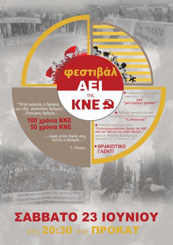 Έλα κι εσύ στις εκδηλώσεις του Φεστιβάλ μας! Φέτος γιορτάζουμε τα 100 χρόνια ζωής και δράσης του ηρωικού ΚΚΕ και τα 50 χρόνια της Νεολαίας του, της ΚΝΕ!
