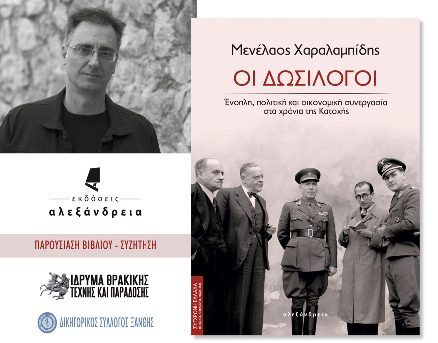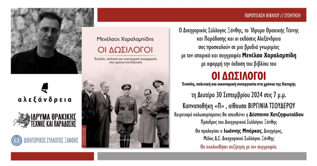 Το Ίδρυμα Θρακικής Τέχνης και Παράδοσης, ο Δικηγορικός Σύλλογος Ξάνθης και οι Εκδόσεις Αλεξάνδρεια, παρουσιάζουν στην Ξάνθη, τη Δευτέρα 30 Σεπτεμβρίου, στις 19:00, το βιβλίο του ιστορικού κ. Μενέλαου Χαραλαμπίδη «Οι Δωσίλογοι. Ένοπλη, πολιτική και οικονομική συνεργασία στα χρόνια της Κατοχής».