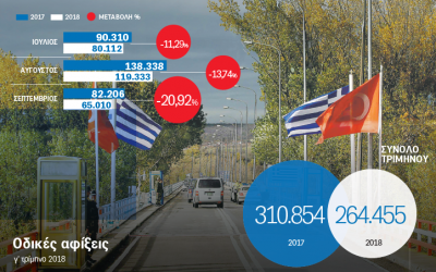 Οι διελεύσεις Τούρκων από τις δύο ανατολικές πύλες εισόδου της χώρας -τους µεθοριακούς σταθµούς των Κήπων και των Καστανεών στον Εβρο- υποχώρησαν κατά 15% στο τρίτο τρίµηνο του 2018, σύµφωνα µε τα επίσηµα στοιχεία της Αστυνοµίας, που επεξεργάστηκε και έδωσε στη δηµοσιότητα η Οµοσπονδία Εµπόρων και Επιχειρηµατιών Θράκης.