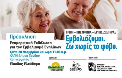 *Ενημερωτική εκδήλωση με θέμα τον εμβολιασμό ενηλίκων πραγματοποιείται από τη Διεύθυνση Κοινωνικής Προστασίας Δήμου Ξάνθης την Τρίτη 20 Νοεμβρίου 2018, στις 11 το πρωί, στο κτίριο του κεντρικού ΚΑΠΗ της πόλης, επί της οδού Καπνεργατών 1.