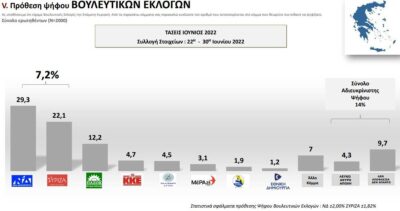 *Στην πρόθεση ψήφου, η ΝΔ συγκεντρώνει 29,3% έναντι 22,1% του ΣΥΡΙΖΑ. Τρίτο το ΠΑΣΟΚ με 12,2% και ακολουθούν ΚΚΕ με 4,7%, Ελληνική Λύση 4,5% και ΜέΡΑ25 με 3,1%. Η αδιευκρίνιστη ψήφος είναι στο 14%.