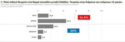 Το 61,4% δηλώνει ότι θεωρεί πολύ ή αρκετά πιθανό ένα θερμό επεισόδιο Ελλάδας-Τουρκίας μέσα στον επόμενο χρόνο, έναντι 33% που δεν το θεωρεί τόσο πιθανό.