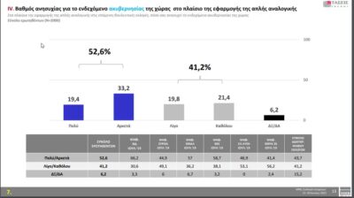 *Άλλο στοιχείο της δημοσκόπησης. Το 52,6% ανησυχεί πολύ ή αρκετά για το ενδεχόμενο ακυβερνησίας της χώρας με την απλή αναλογική έναντι 41,2% που δηλώνει ότι ανησυχεί λίγο ή καθόλου.