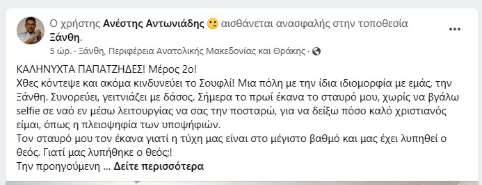 «Χθες κόντεψε και ακόμα κινδυνεύει το Σουφλί! Μια πόλη με την ίδια ιδιομορφία με εμάς, την Ξάνθη. Συνορεύει, γειτνιάζει με δάσος. Σήμερα το πρωί έκανα το σταυρό μου, χωρίς να βγάλω selfie σε ναό εν μέσω λειτουργίας να σας την ποσταρώ, για να δείξω πόσο καλό χριστιανός είμαι, όπως η πλειοψηφία των υποψήφιών.