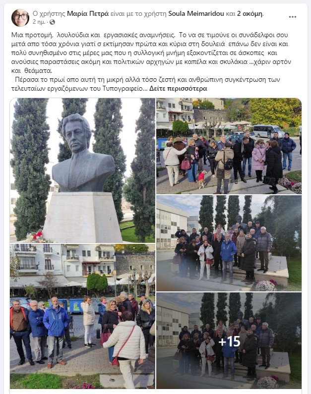 Μια προτομή, λουλούδια και εργασιακές αναμνήσεις. Το να σε τιμούνε οι συνάδελφοι σου μετά από τόσα χρόνια γιατί σ εκτίμησαν πρώτα και κύρια στη δουλειά επάνω δεν είναι και πολύ συνηθισμένο στις μέρες μας που η συλλογική μνήμη εξακοντίζεται σε άσκοπες και ανούσιες παράστασεις ακόμη και πολιτικών αρχηγών με καπέλα και σκυλάκια… χάριν αρτόν και θεάματα.