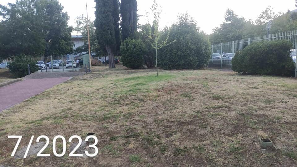 (Όλο σχεδον το πάρκο είναι χρώμα κίτρινο το δε γκαζόν αποτιστο και πληθώρα πλατανοφυλλα κιτρινα ως χαλί καφέ στο χώμα,γιατί ούτε τα πλατάνια δροσίζονται.Και να φανταστεί κανείς ότι τελικά δίπλα ακριβώς ρέει νερό, έστω και λίγο στον χείμαρρο Κοσινθο της Ξάνθης.Ενα πάρκο καταπράσινο από το 2015 έως και το 2019…..!!!)
