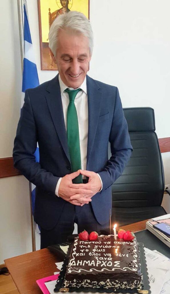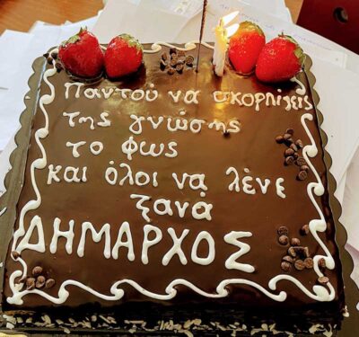 Ιδιαίτερο το μήνυμα επάνω στην τούρτα – Παντού να σκορπίζεις της γνώσης το φως και όλοι να λένε ξανά ΔΗΜΑΡΧΟΣ»
