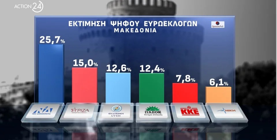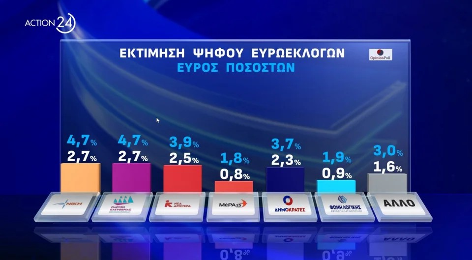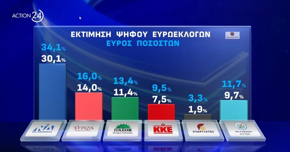 -Στην δημοσκόπηση, που παρουσιάστηκε στο Κεντρικό δελτίο ειδήσεων του Action24 με τον Βασίλη Τσεκούρα, η ΝΔ έχει «αέρα» κυριαρχίας και μάλιστα μπορεί να υπερβεί και το ποσοστό των προηγούμενων ευρωεκλογών όπου είχε λάβει 33,1%. Στη δεύτερη θέση παγιώνεται και σε αυτή τη δημοσκόπηση ο ΣΥΡΙΖΑ πολύ χαμηλότερα ωστόσο, ενώ το ΠΑΣΟΚ ακόμη και στο ταβάνι του είναι πίσω από το κόμμα Κασσελάκη.