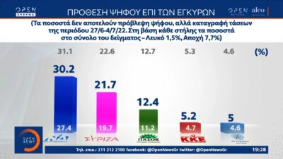 *Στην πρόθεση ψήφου επί των έγκυρων, η Νέα Δημοκρατία συγκεντρώνει 30,2% (από 31,1% τον Ιούνιο) και ο ΣΥΡΙΖΑ 21,7% (από 22,6%), δηλαδή διαφορά 8,5 μονάδων. Ακολουθούν το ΠΑΣΟΚ/ΚΙΝΑΛ 12,4% (από 12,7%), το ΚΚΕ 5,2% (από 5,3%), η Ελληνική Λύση 5% (από 4,6%) και το ΜέΡΑ25 με 3% (από 3,5%). Στο 14,1% οι αναποφάσιστοι, ενώ το 5,6% απαντά «άλλο κόμμα».