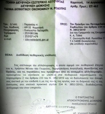 Από την «Γενική Διεύθυνση Εσωτερικής Λειτουργίας Διεύθυνση Διοίκησης τμήμα Διοικητικού Οικονομικού της Ροδόπης» εστάλει προς τον πρόεδρο του πενταμελούς συμβουλίου του άρθρου 234 του Ν. 3852/2010, επιστολή με την οποία ζητάει, με βάσει τα έγγραφα που επισυνάπτει, να εξετάσει εάν ο Χρίστος Μέτιος έχει υποπέσει σε πειθαρχικά παραπτώματα και να του επιβάλει ή όχι την ποινή της αργίας.