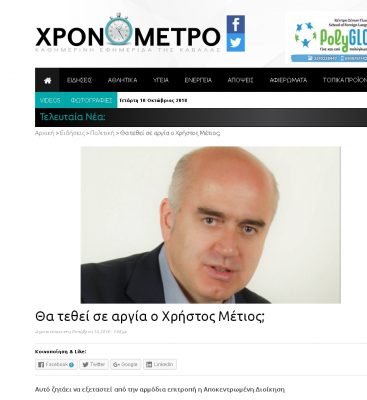 *Δεν πρέπει να έχει παράπονα ο Περιφερειάρχης Χρήστος Μέτιος αφού πριν προλάβει να τον «ανακοινώσει» ο Πρόεδρός του Κυριάκος Μητσοτάκης, το όνομά του άρχισε να μπαίνει…πρώτη σελίδα!
