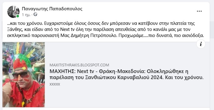*Αμέσως μετά την παρέλαση ο Πάνος Παπαδόπουλος με λιτή ανάρτησή του ευχαρίστησε τον κόσμο που προτίμησε το Next tv για να δει την φετινή παρέλαση του Ξανθιώτικου Καρναβαλιού