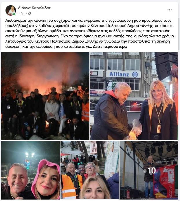 *Η διευθύντρια του πρώην Κέντρου Πολιτισμού και νυν της διεύθυνσης που σε κάθε Καρναβάλι είναι με τον εκάστοτε Πρόεδρο ή αντιδήμαρχο Πολιτισμού Λιάνα Καρολίδου (σ.σ. Όπως στο φετινό Καρναβάλι….) με ανάρτησή της, ευχαριστεί τους… υπαλλήλους (!), νομίζοντας προφανώς ότι απευθύνεται σε… «γιουσουφάκια» και δεν γνωρίζουμε τόσα χρόνια ούτε τον «ρόλο» της ούτε τι συμβαίνει από την εποχή Φανουράκη, Λύρατζη ακόμη μέχρι την εποχή Ηλία Ασκαρίδη!!!
